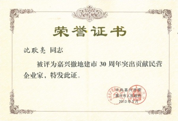 市委副书记高玲慧首先宣读了市委、市政府《关于表扬嘉兴撤地建市30周年民营企业生长先进集团和先进小我私家的决议》,, ,,,,市四套班子向导为获奖企业和小我私家颁奖。。。。。。。。公司董事长沈耿亮被授予“突出孝顺民营企业家”。。。。。。。。